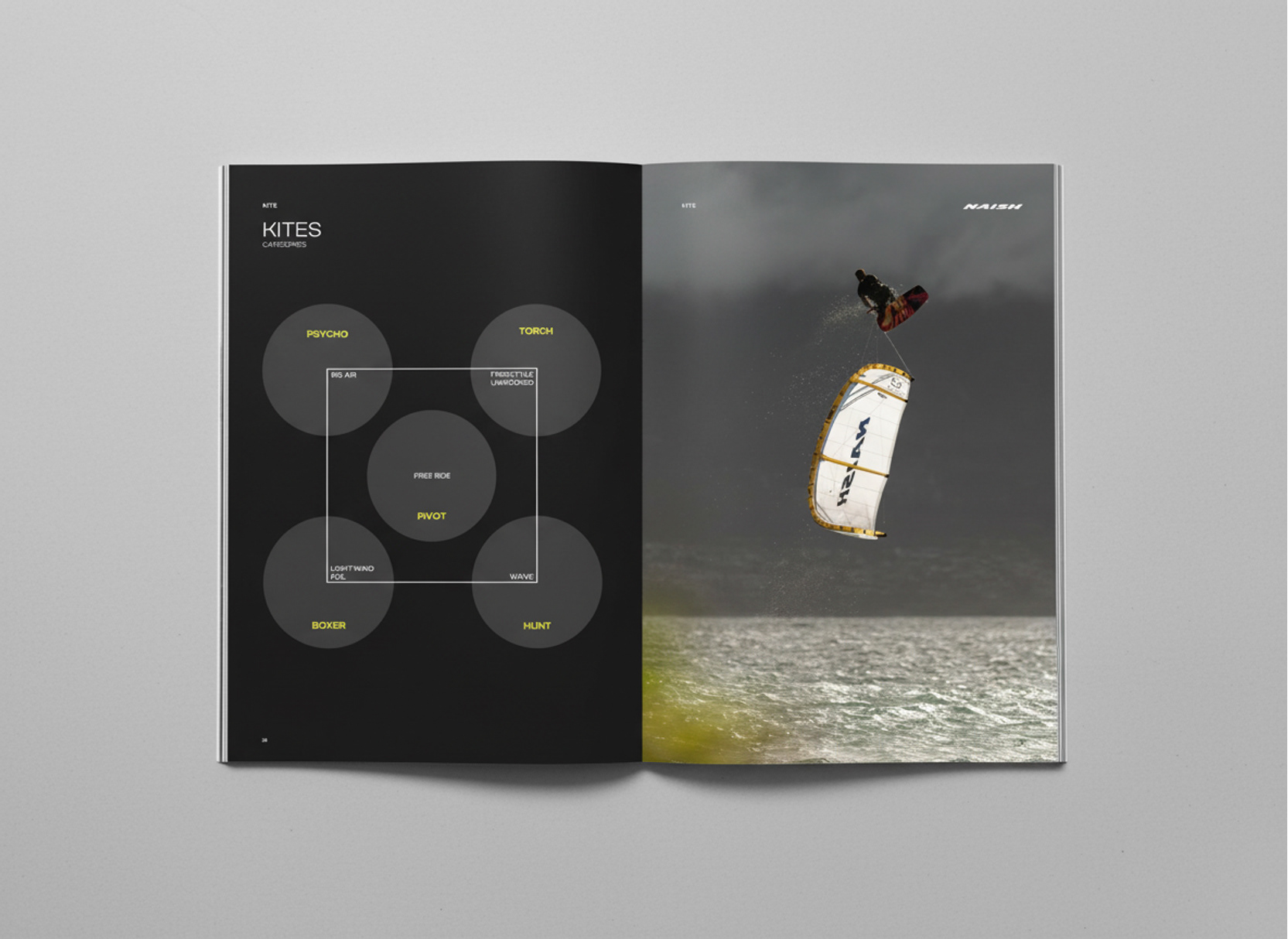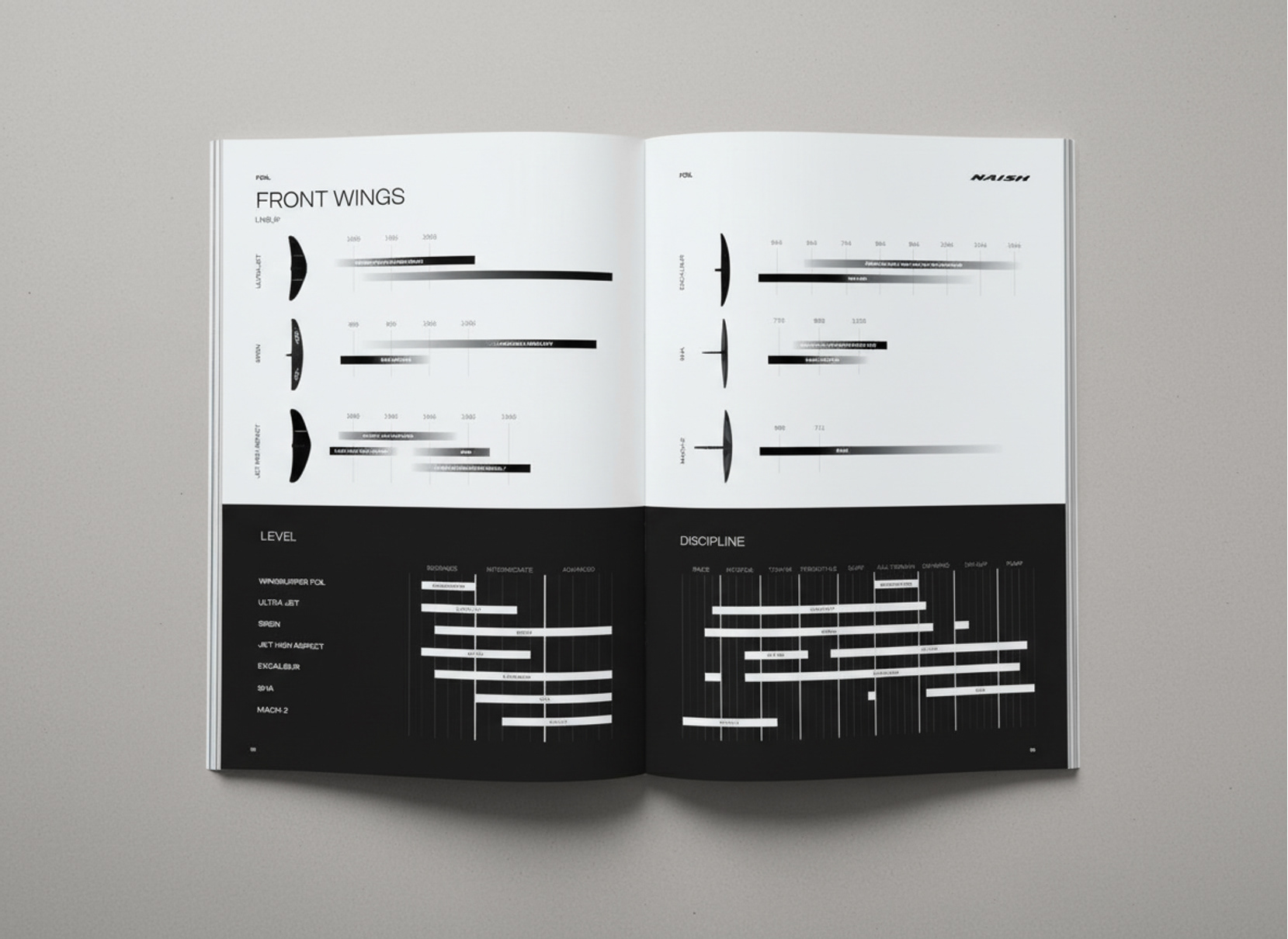 Creating the product book for watersports brand Naish, including all their products for kite, foil and windsurfing range.